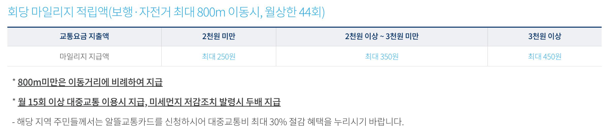 월 15회 이상 알뜰교통카드로 대중교통 이용 및 주민등록상 주소지 확인되어야 마일리지 지급됩니다.